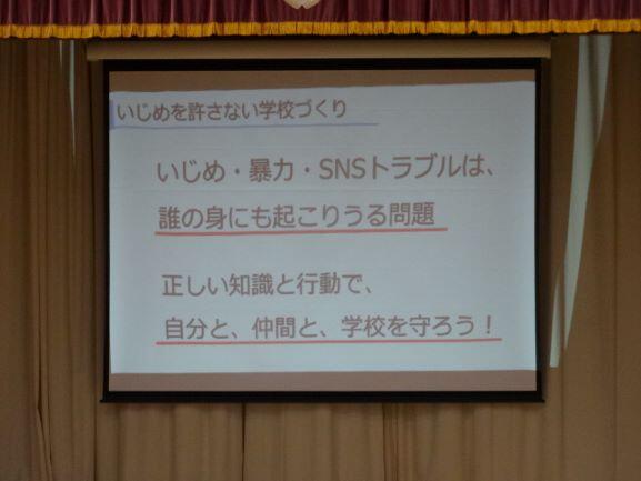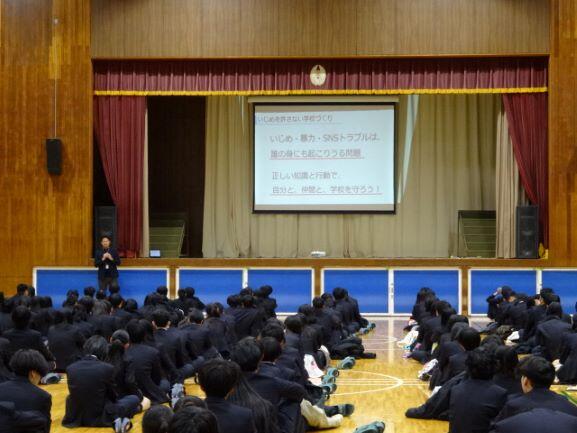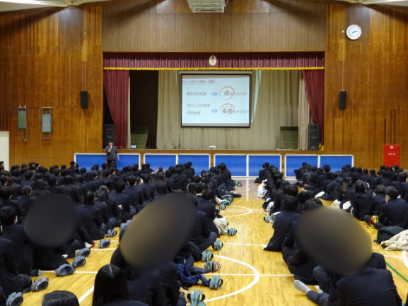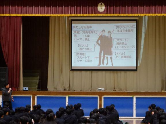 はじめに身だしなみ指導を行ったあと、生徒指導主事の先生、人権教育推進委員長の先生からの話がありました。内容は、SNS等における不適切な動画や画像等の投稿や、いじめに関することの注意喚起を行いました。