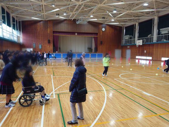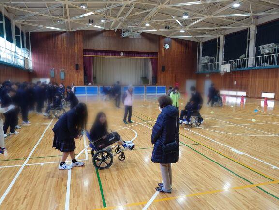 生徒のみなさんは車いす体験、身体障がい者のお話、点字体験などに取り組みました。車いす体験では体育館にてペアになり、人を乗せて操作しました。車いすに乗っていると意外と少しの段差でも大きく感じることがわかったことでしょう。