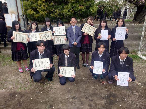 さらに、その後、部活動において表彰を受けたみなさんに賞状を授与しました。女子ソフトボール部は北摂連合チームとしてつくし杯で3部優勝、公立高校大会でCリーグ優勝を果たしました。ソフトテニス部は連盟杯春季大会で3位の成績を残しました。また、書道同好会はふれあい書道展や全日本書初め大展覧会にて特選を果たすなど輝かしい成果を収めました。