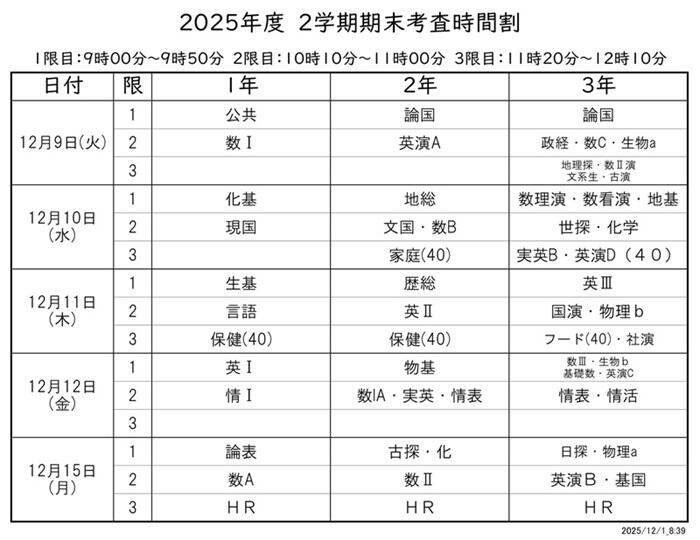 12/9(火)から始まる2学期期末考査の時間割を発表します。