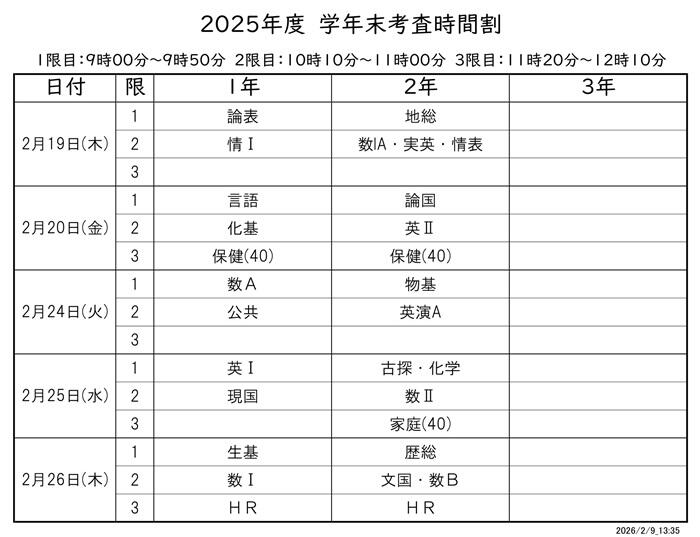 2/19(木)から始まる1・2年学年末考査の時間割を発表します。