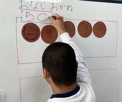 中学部2年生の職業B班では、お金の学習をしています。 実際にお金を使って≪10円5枚だと何円になる?≫や、≪50円を財布から出してみよう≫などみんなで考えました。学習を通して、お金の数え方やお金の種類についても理解できました。 また、普段の生活の中で実際にお店に行った時にやりとりをしながらお金について理解を深めていって欲しいと思います。