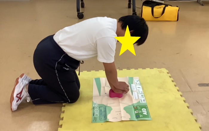 高等部3年生の保健の授業で応急手当や心肺蘇生法について学習しました。 生徒同士がペアになり、ケガをしたポイントを決め、絆創膏を貼る練習をお互いにしたり、練習用キットや人形、練習用AEDを使ってグループで心肺蘇生法の練習をしたりしました。 心肺蘇生法の練習を行ってみると、「思っていたよりしんどかった」と感想を伝える生徒が多かったです。また、「心肺蘇生法をする」「AEDを持ってくる」「救急車要請をする...