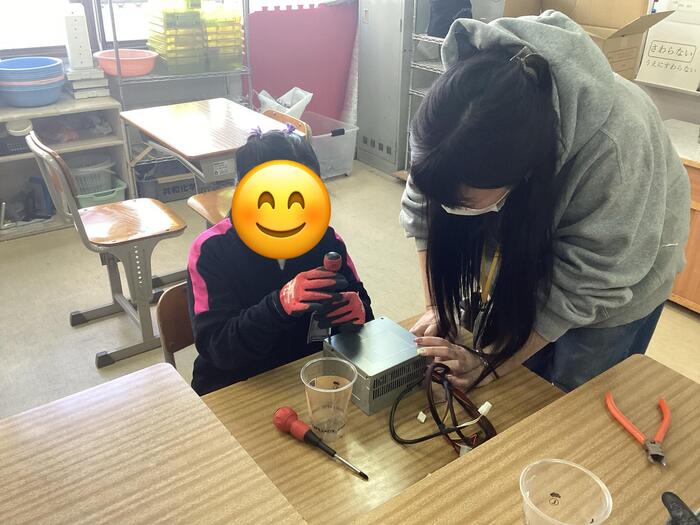 地域の作業所の方が出前授業に来ていただきました。作業内容は機械の解体でした。工具の使い方や解体の順番など丁寧に教えてくださいました。生徒たちは真剣に取り組んでいました。地域の方との交流を通して、働くことの楽しさと社会とのつながりを学ぶ貴重な経験となりました。