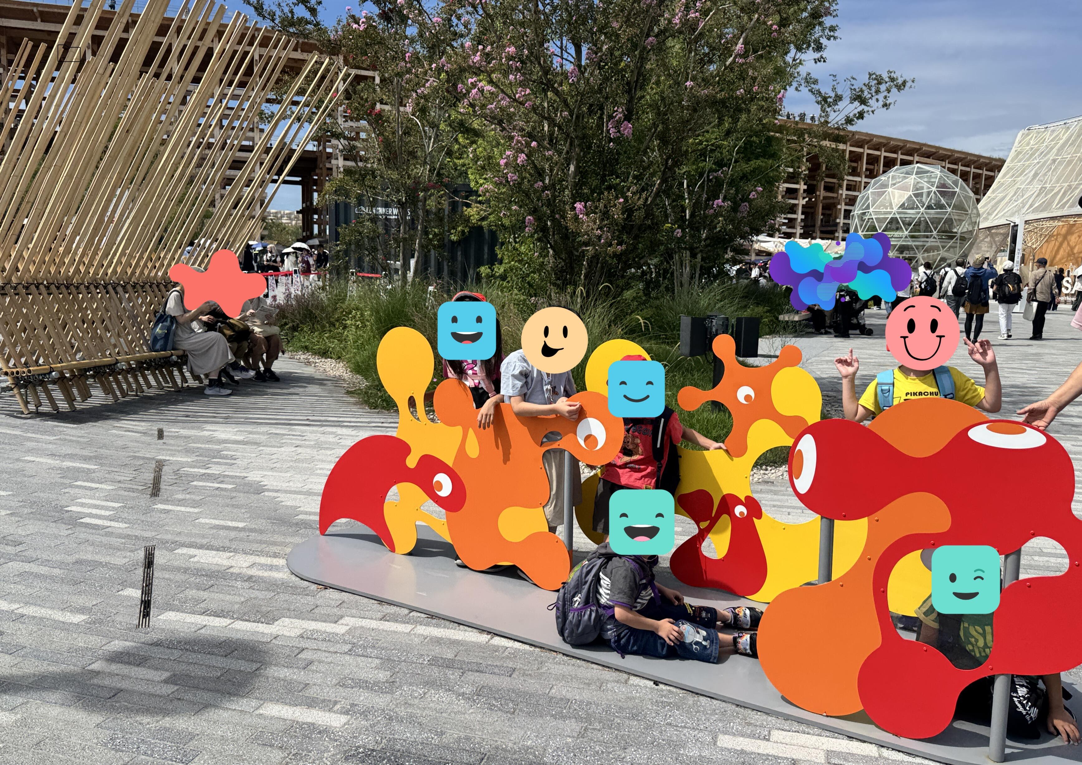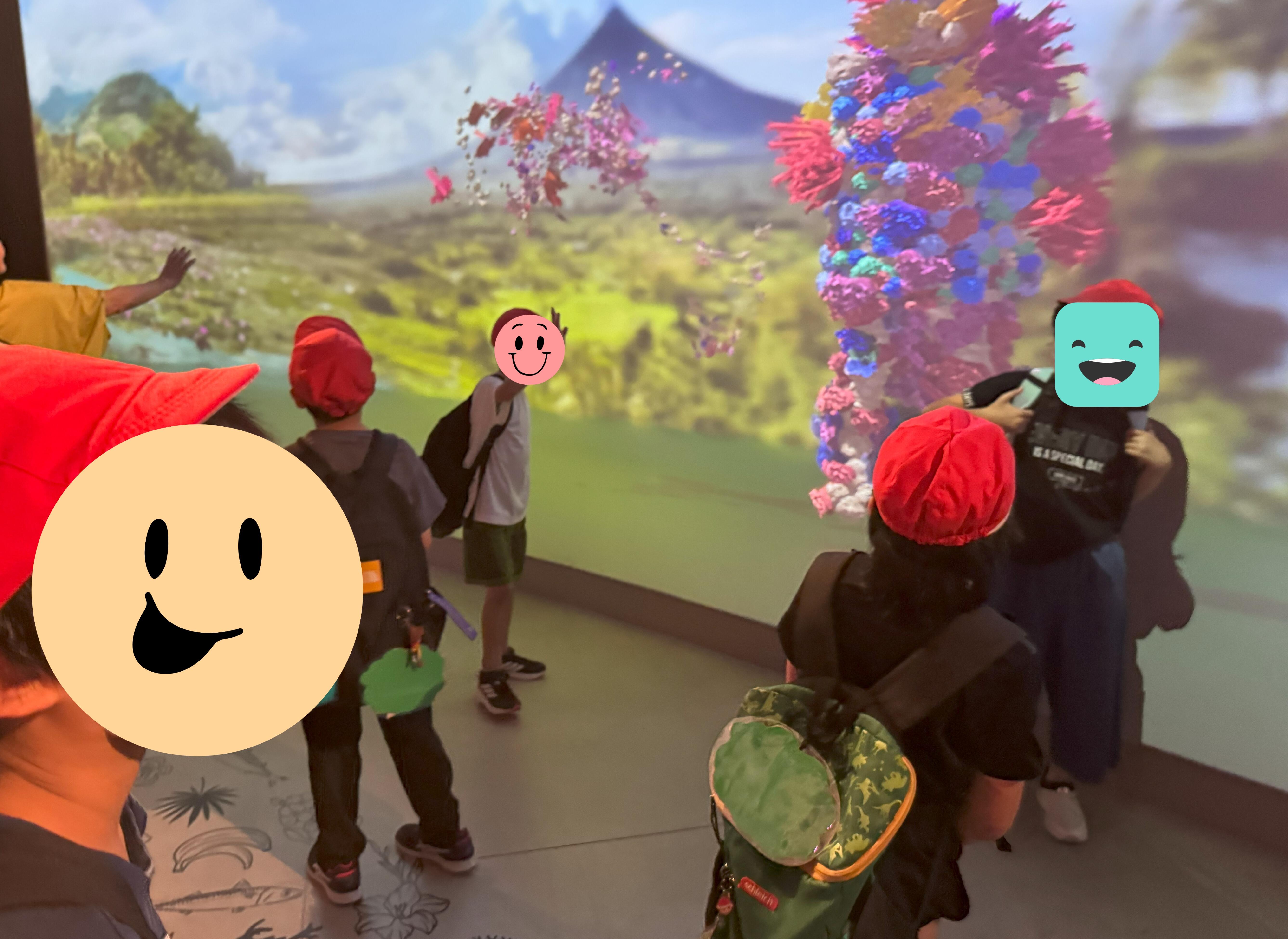 1年生は、はじめにフィリピン館に行きました。大型スクリーンの前に立った子どもたちの動きに合わせて、植物や魚をまとった影が投影され、みんなでダンスして楽しみました。また、コモンズAではいろいろな国の展示を見学しました。風が気持ちいい大屋根リングの上を散歩したり、NTT館の音のなるワイヤーを触ったりしました。