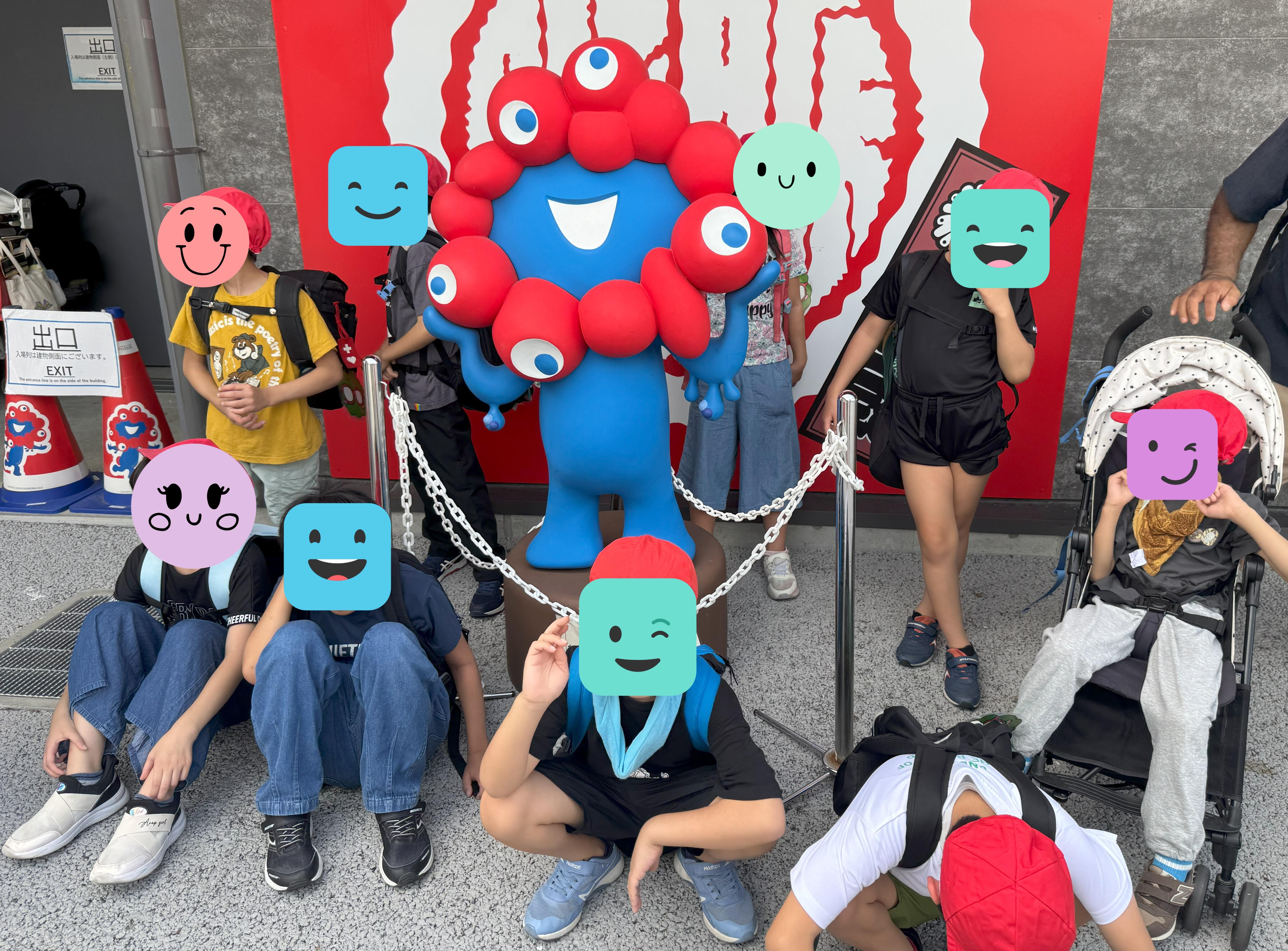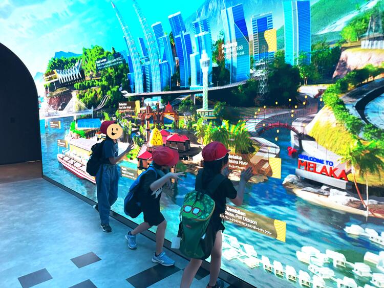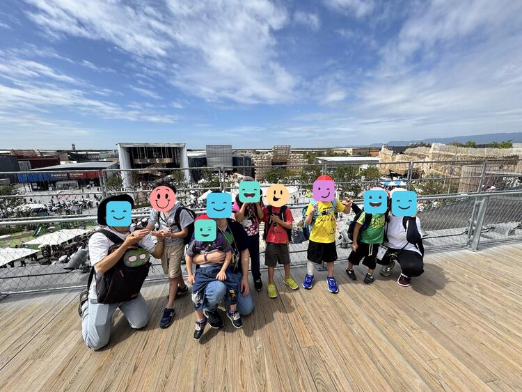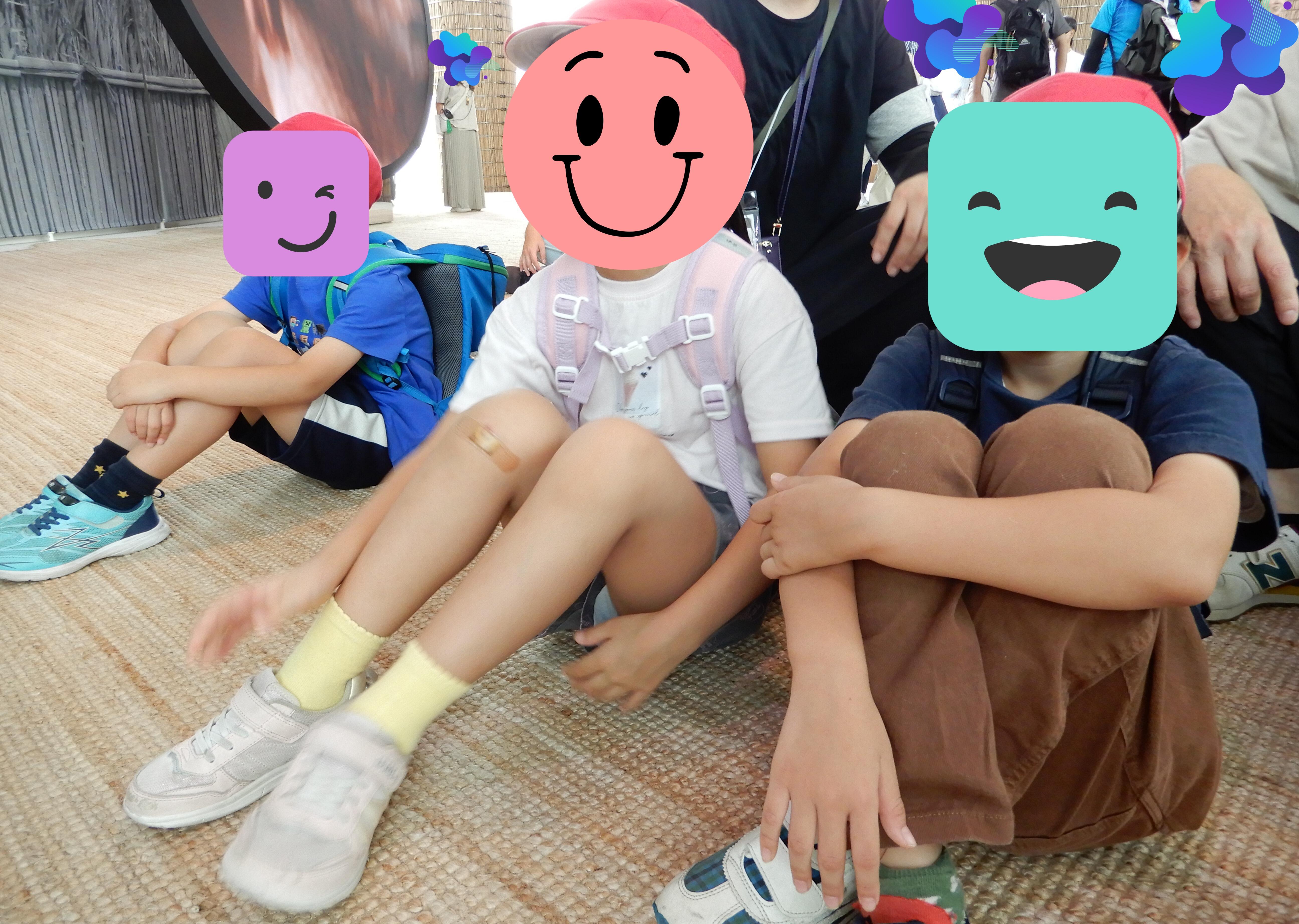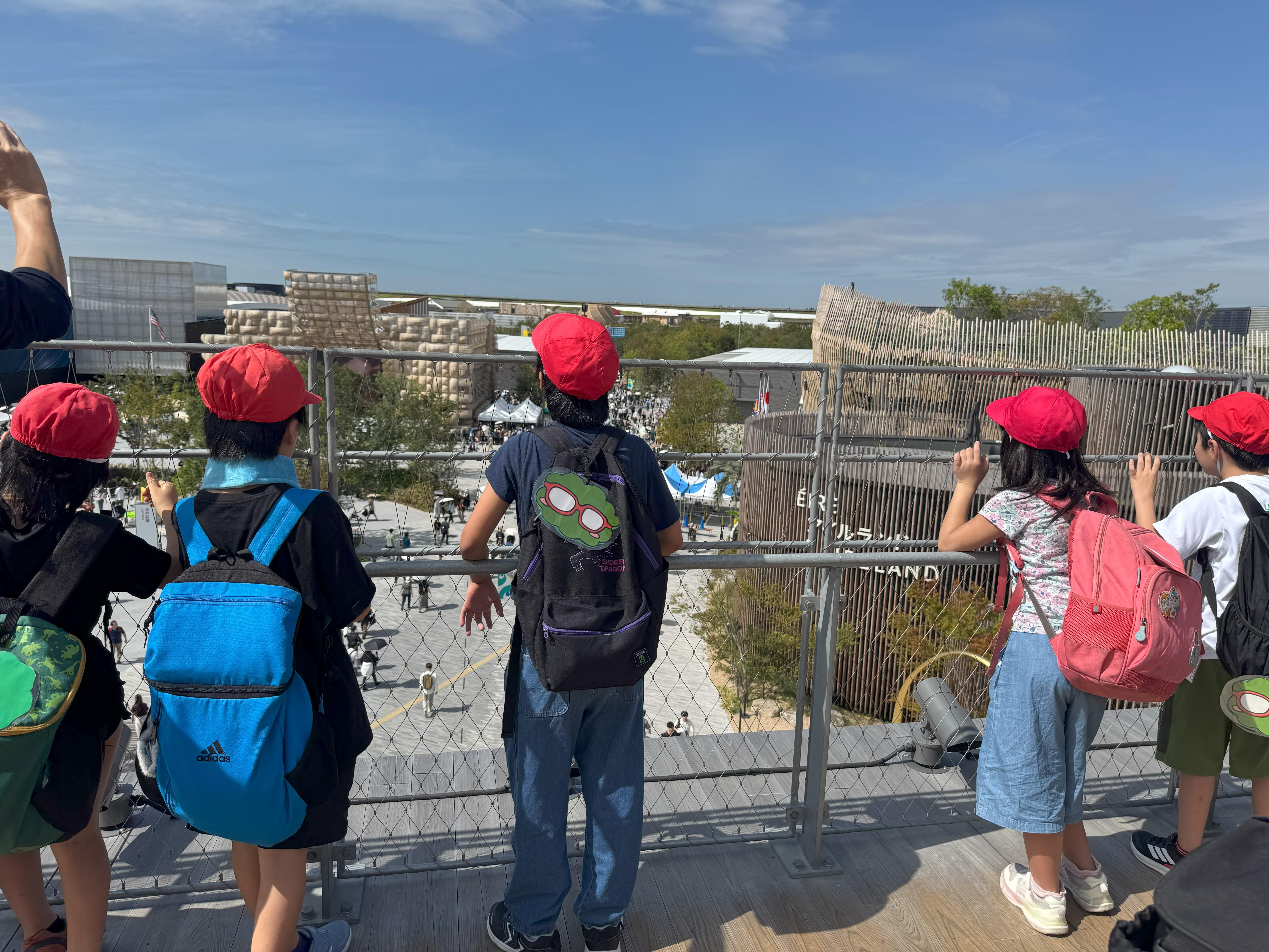 3年生は、大屋根リング上を散歩して集合写真を撮った後、フィリピン館に行きました。照明が暗くなり、天井や布に光や映像が投影されるとみんな驚いて見ていました。大型スクリーン前でのダンスを楽しんだ後は、マレーシア館に行きました。屋台の食品サンプルや街並みの展示を見たり、トンネル状の通路いっぱいに映し出されたマレーシアの風景を見学したりしました。光の広場の遊具でたくさん体を動かして遊び、ミャクミャク館前のミニミャクミャクと写真を撮りました。
