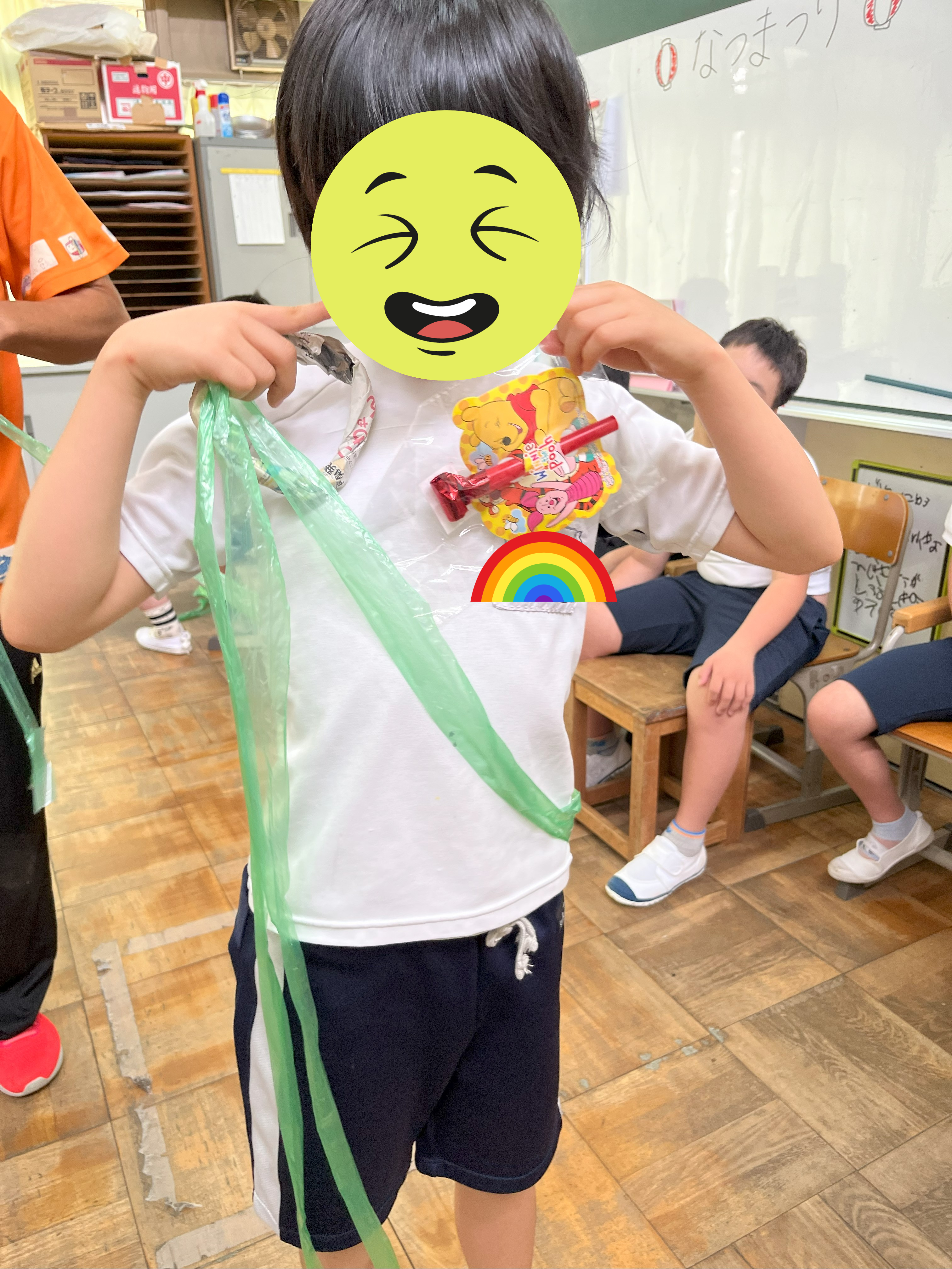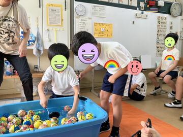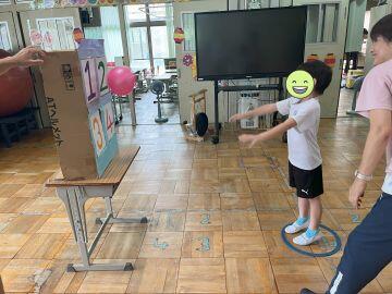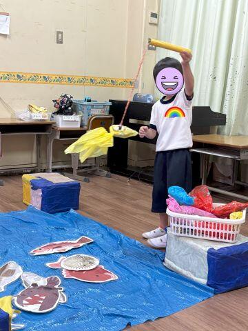 魚釣りでは、大きい魚を磁石で釣って喜んでいる子や集中して揺れる釣り糸を好きな魚に近づけて釣っている子たちがいました。ボールすくいでは、水の冷たさを楽しんだりたくさんのボールをお玉ですくおうと一生懸命に頑張ったりしている姿が見られました。ストラックアウトでは、好きなキャラクターを狙い、ボールを的に命中させて大喜びして楽しんでいました。千本釣りでは、引っ張ったひもの先に付いてある景品を見て嬉しそうな顔をする子どもたちがたくさんいました。