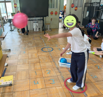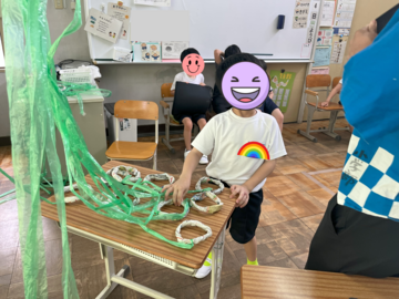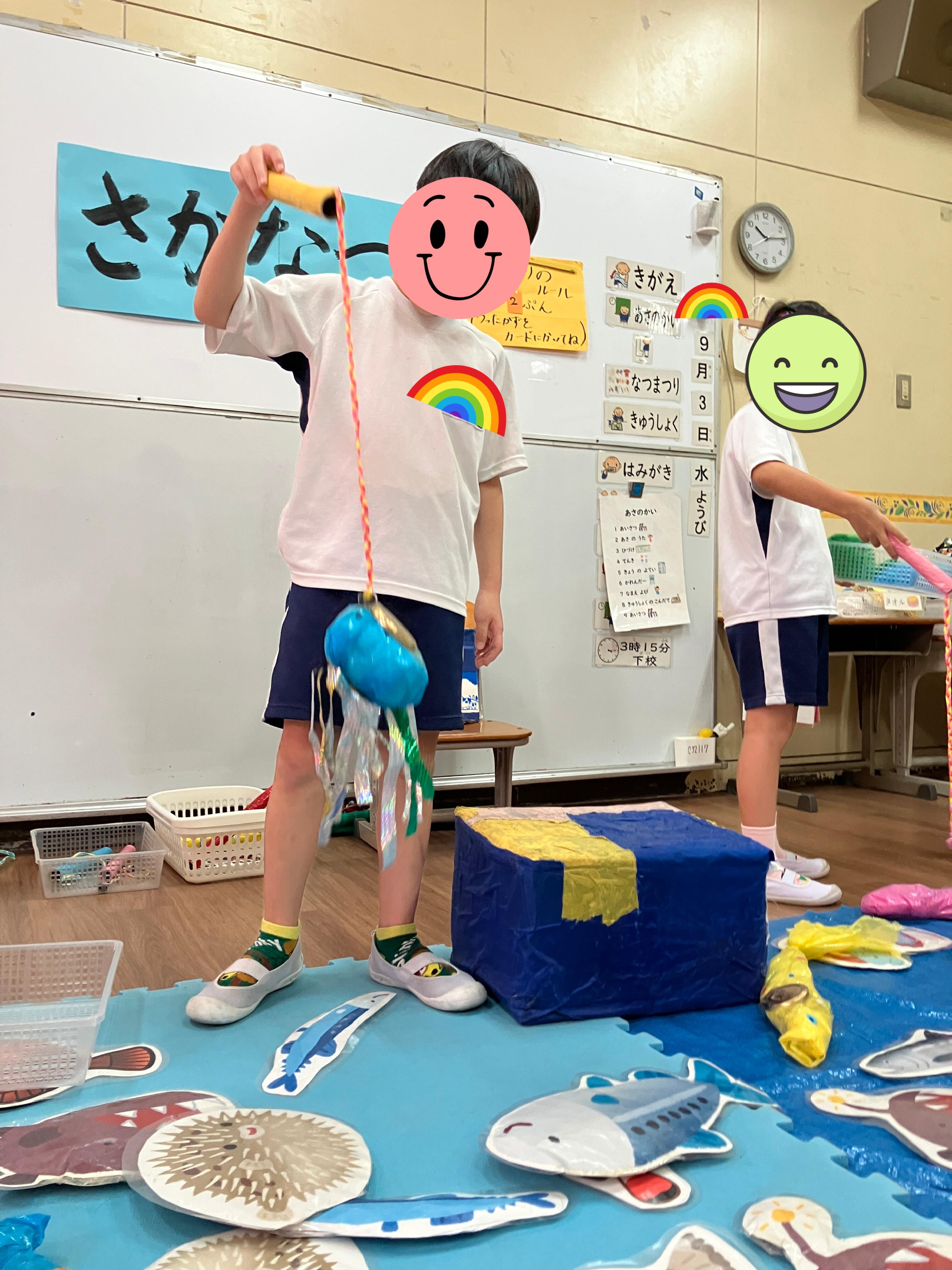 各学年に分かれて、魚釣りやボールすくい、ストラックアウト、千本引きの4つの出店を体験したり、みんなでエビカニクス音頭を踊ったりして夏まつりを楽しみました。