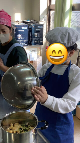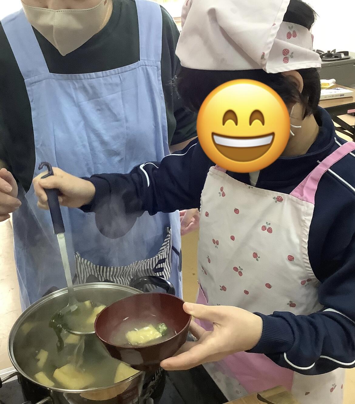 調理実習では、①食材を切る②鍋に切った食材と水を入れ、火にかける③味噌を溶いて入れる④お椀によそうの手順をそれぞれ決められた役割でしっかり取り組むことができました。だんだんと味噌汁が完成に近づくにつれて、「早く食べたい!」「おいしそう!」など、子どもたちはウキウキしながら鍋を眺めていました。やっと完成し、自分達で作った味噌汁を食べた子どもたちの感想は「おいしい!」「おかわり!」の連発で、すぐにペロリと食べ、お椀を持っておかわりをしに来る姿が多く見られました。