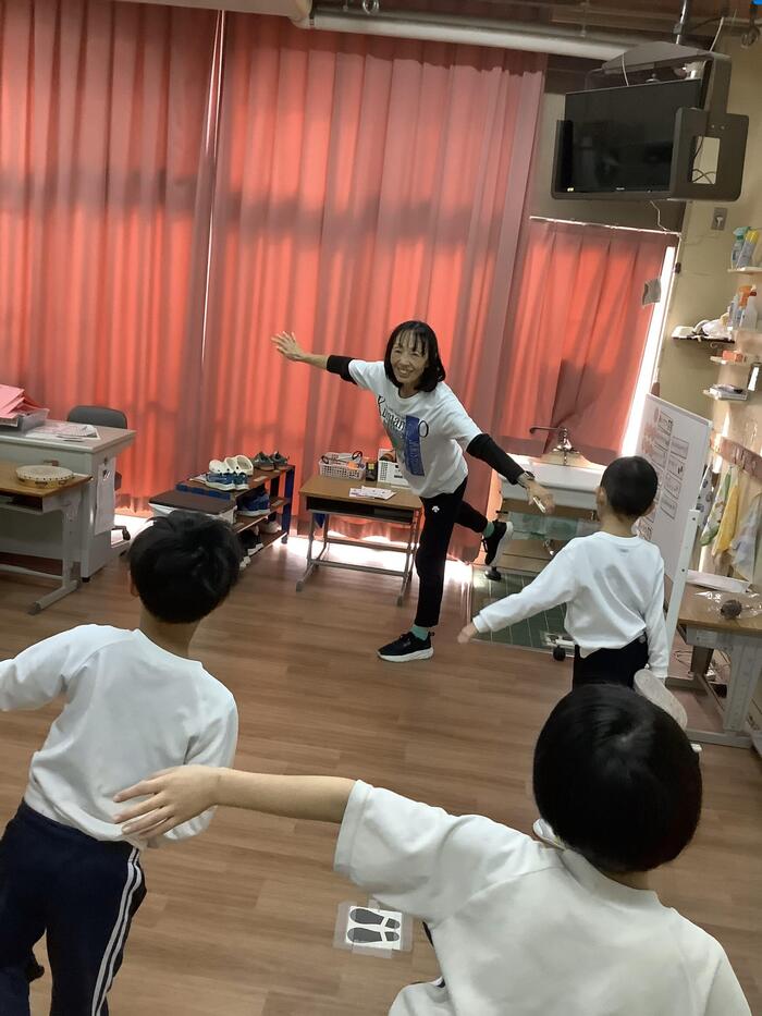 10月の歌で取り入れた『とんぼのめがね』の曲で、両腕を横に伸ばしてとんぼになって身体を動かしました。1番は通常の速度、2番はゆっくりの速度、3番は速い速度と変えましたが、しっかり音楽を聴いて合わせて動くことができました。曲の切れ目で歌が止まり、「ピッ!」の掛け声を聴くと片足を後ろに上げることにも挑戦しました。
