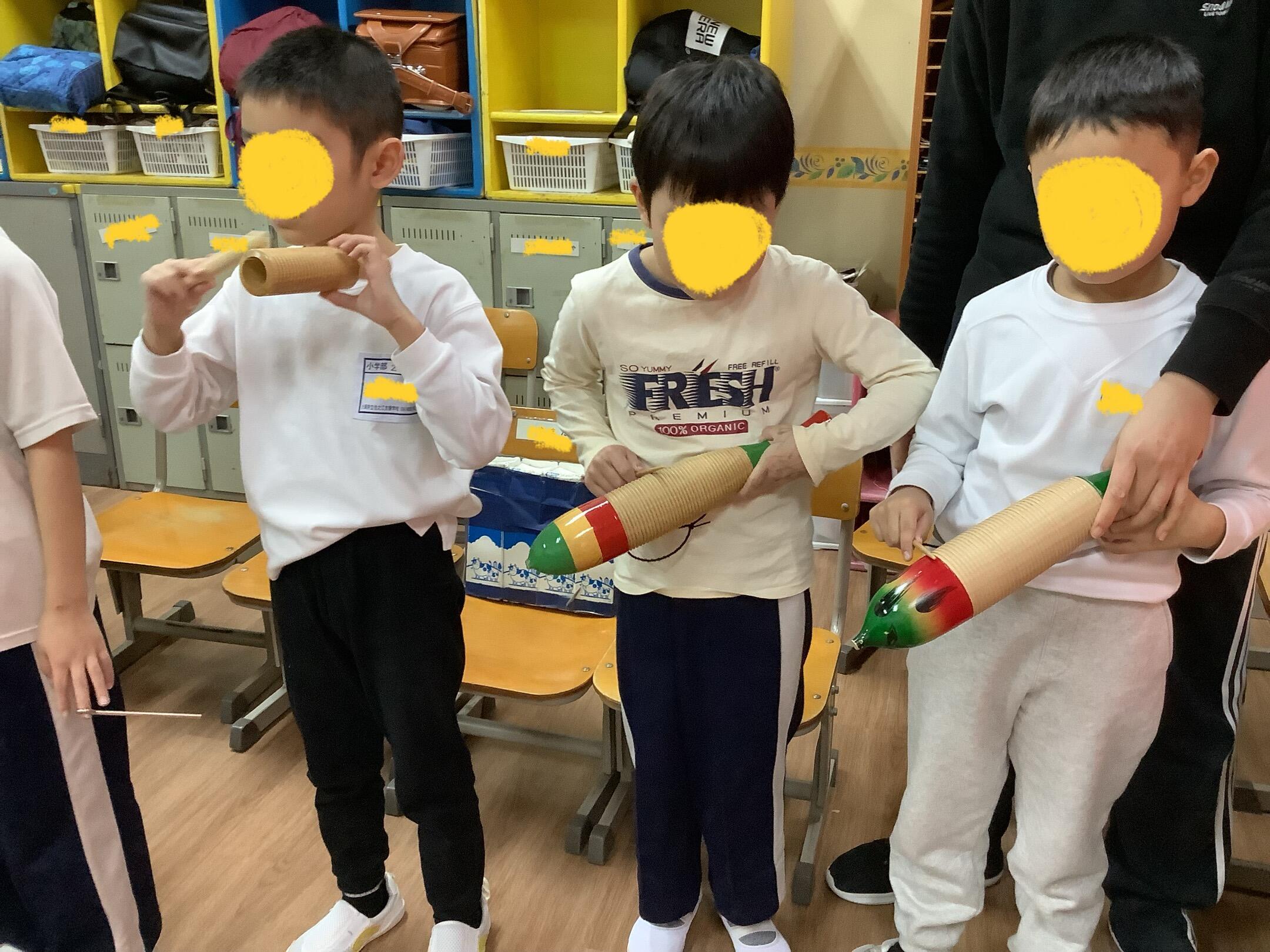 3回パネルシアターを見た後、5種類の楽器(トライアングル、鈴、ギロ、カスタネット、マラカス)で演奏を楽しみました。子どもたちは楽器が大好きです。