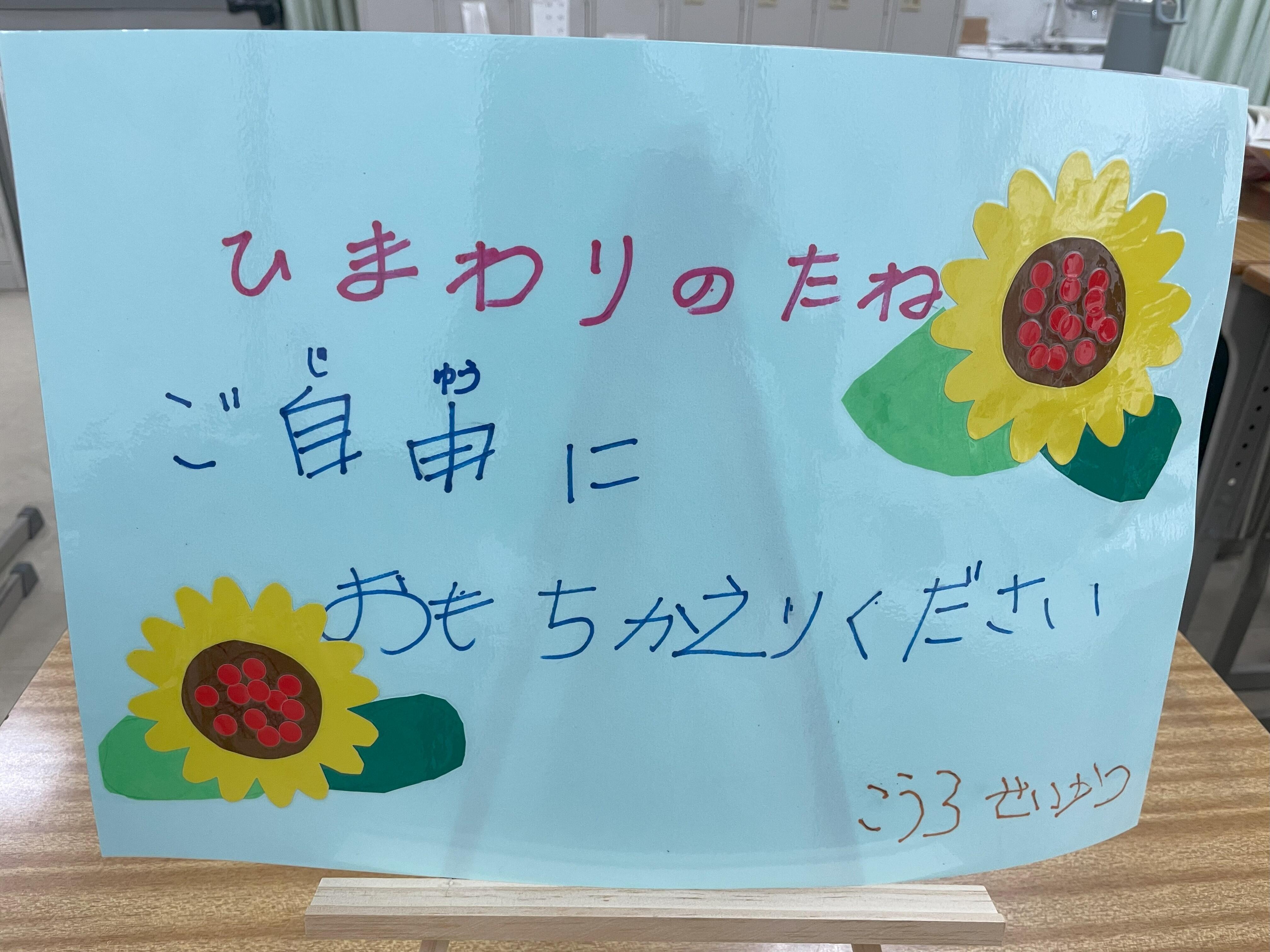 ひまわりの種を数えたり、メッセージカードにスタンプを押したりと、自分たちが卒業したあとにも住之江支援学校で咲いてくれることを願いながら一生懸命に作りました。スタンプを押す際、ひまわりの種の部分がちょうど真ん中になるように慎重に押しました。看板も手作りしました。