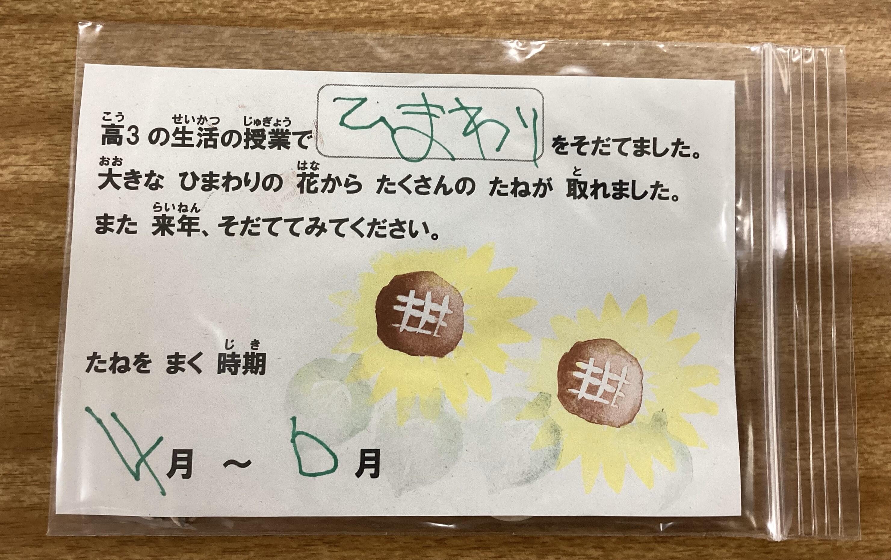 高等部3年生の生活の授業では、夏に育てたひまわりの種を収穫し、袋詰めをして学校祭で配布しました。