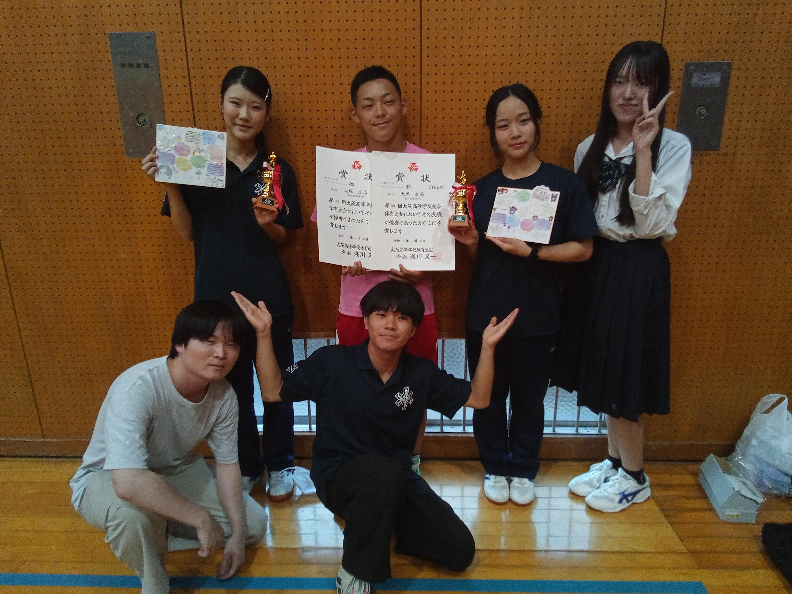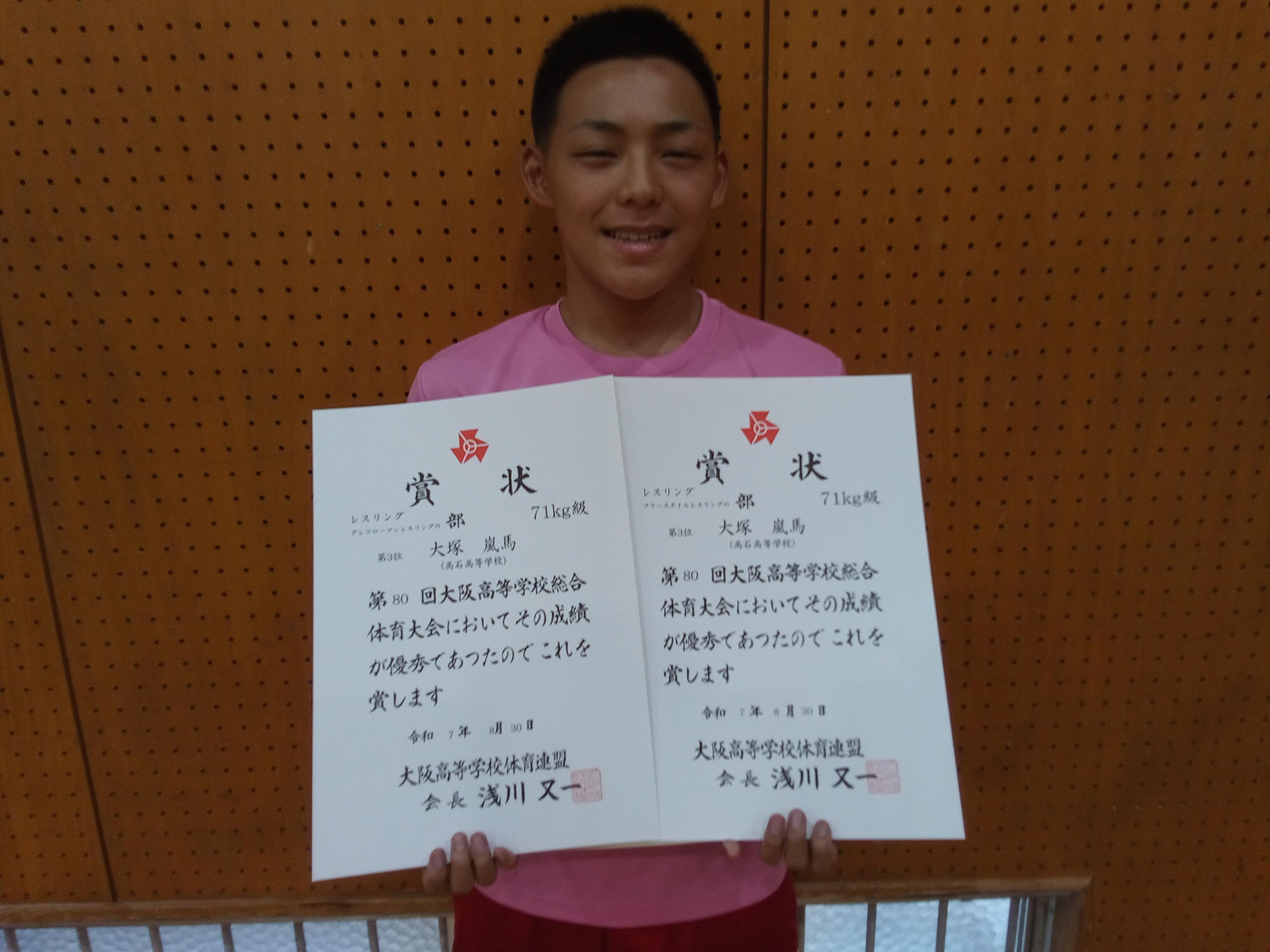 本日(R7.8.30)、第80回大阪高等学校総合体育大会(レスリング競技の部)が長尾谷高等学校(近畿情報高等専修学校)体育館にて開催されました。 本校の大塚嵐馬くんが、フリースタイルレスリングの部(71kg級)およびグレコローマンレスリングの部(71kg級)の両方で第3位と活躍しました。また、マネージャーの藤岡結羽さん、中谷海美さんも3年間運営に貢献してくれたので、大阪高体連レスリング専門部から感謝のトロフィーをいただきました。