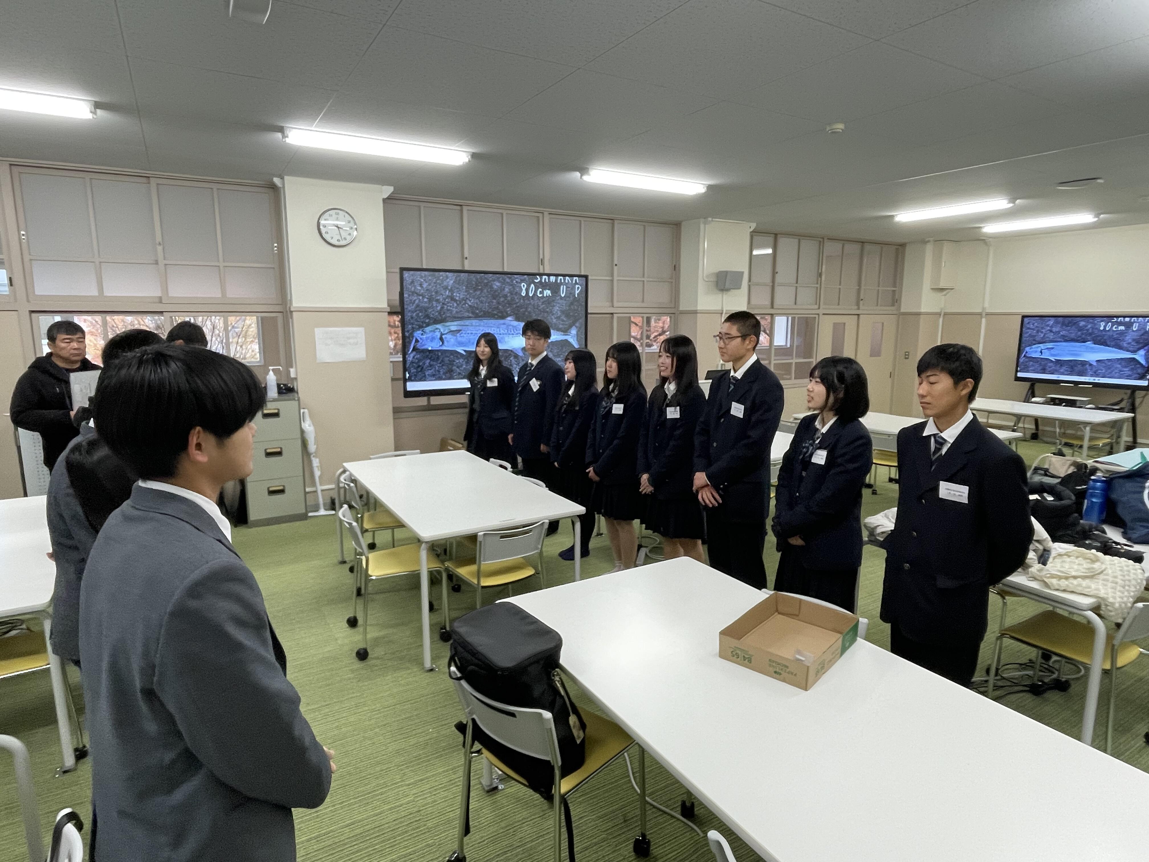 11月18日(1日め)、金沢北陵高校との交流会です。まずは、浅尾校長先生をはじめ生徒会のみなさんの案内で学校内の被災場所の見学をしました。 その後、金沢北陵高校の生徒会のみなさんと一緒に3つのグループに分かれて、ディスカッション→発表を行いました。