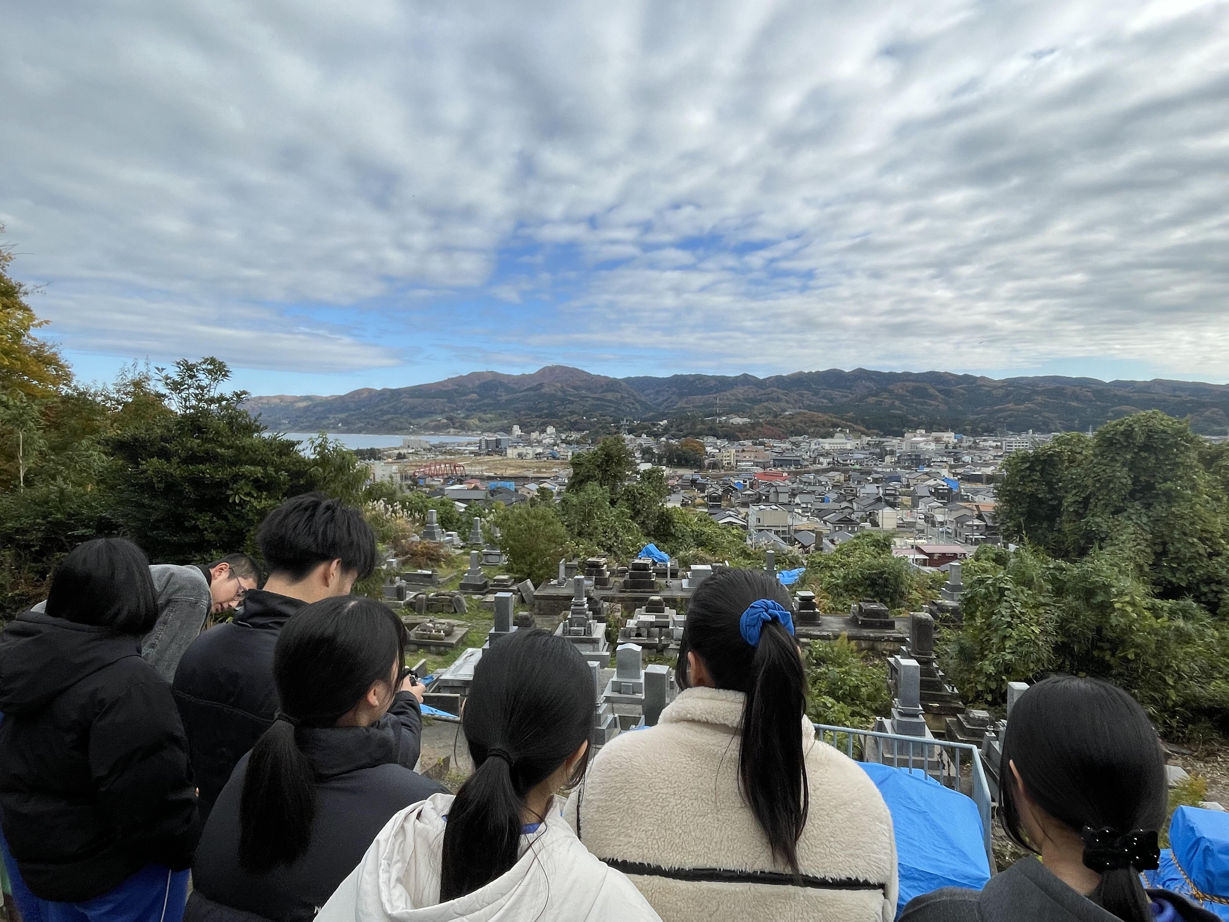 裏山に案内していただき、輪島市内を一望できるスポットに連れて行ってもらいました。震災後に火事があって更地になっている輪島朝市跡を見たりし、一人ひとりが当時の状況や今後の対策について考えるきっかけになりました。