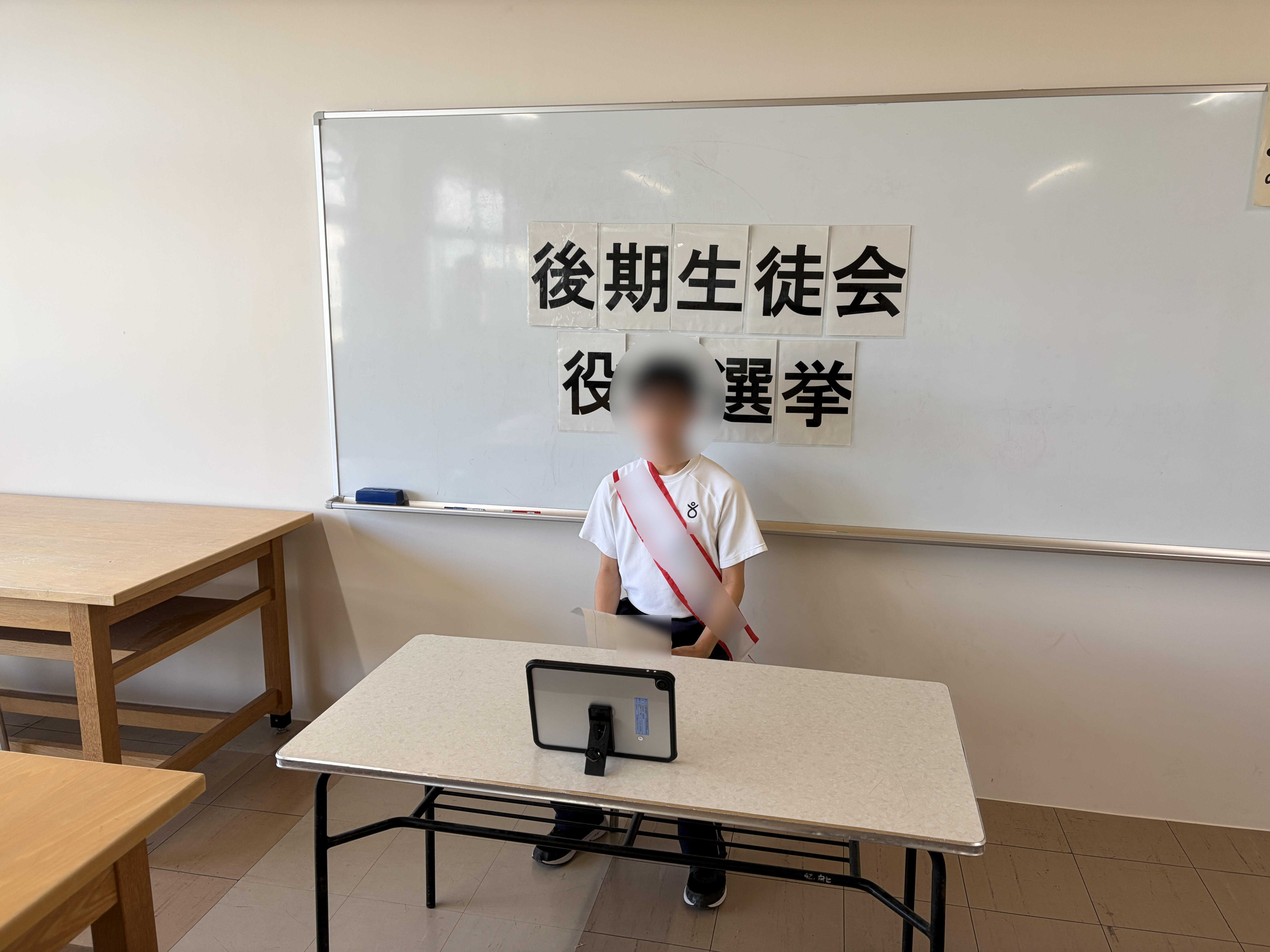 投票前の最後の演説は、オンラインで各教室をつなぎ、映像として配信されました。緊張した面持ちで待っていた立候補者たちも、自分の順番になると、堂々と演説をして、各教室の生徒たちに自分の気持ちや意気込みを伝えることが出来ました。