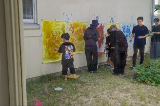 小学部2年生は学年でぬたくりの授業をしていました。中庭の壁には動物マークのついた模造紙を貼っていますが、廊下側のガラスも含めて、子どもたちにはひろーいキャンバスです。手や足に好きな色のペイントをいっぱいつけて、ここぞとばかり塗って楽しんでいました。廊下側から見学に行くと、ガラス越しの私の顔に、ヒゲと耳をペイントしてネコにする児童もいて、私を楽しませてくれました。後半には服も顔も色鮮やかになっていましたが、普段汚さないでねと言われることが多い中で、みんなで楽しんでいるのが素敵でした。模造紙は学習発表会で使うのかな。楽しみですね。