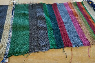 高等部2年生の授業では、今年はさをり織りに取り組んでいます。昨年度、他の支援学校から譲り受けた織り機を使って、自分で糸の色を選び、織り上げた個性あるれるそれぞれの布。それを加工して、それぞれのポーチを作っています。生徒たちがとても集中して織っていたのが素敵でした。