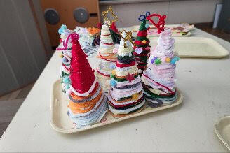 小学部3年生のえがく、つくるの授業ではいろいろな飾りを使ったクリスマス制作をしました。子どもたちは自分で飾りを選び、素材や色、かたちの違いを楽しみながらつくっていきました。モールを使ったり、星を使ったりして、色とりどりの可愛いクリスマスツリーを仕上げました。児童も満足げな表情です。クリスマスのタイミングで持ち帰りたいところですが、作品展で展示しますので、一部をブログで紹介します。