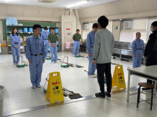ところどころ手順を忘れていることがあるものの、少しずつ1年生も「清掃」に慣れてきました。廊下清掃の様子をお伝えしましょう。 ◆今日の作業の指示を受けて、必要な用具を準備! 糸ラーグを水に濡らして絞ります。 *糸ラーグ...床の水拭き掃除に使うワンタッチモップの先に取付ける糸のことです。 ◆準備が整ったら、作業に出発です。 ◆自在ぼうきで廊下の端を掃きます(端掃き)。 ◆ダストモップ...