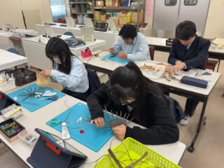 3年生のバックヤードオフィス分野の授業では、カラフルな色のクラフトバンドを使って、かごを作っています。わからないところは、iPadのネット動画を見ながら、自分でクラフトバンドを編んでいきます。 できあがった製品は、先生方にも販売するそうです。23日の農業祭には販売できるかな?