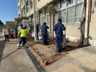 共生推進教室3年生の園芸の様子を見てきました。両高校の期末考査があったので、全員が揃うのは久しぶりです。今日は、落ち葉と米ぬかを交互に入れて、水をかけ、最後に土をかぶせる・・・という作業に取り組んでいました。発酵が進むと腐葉土になります。 校長室の前の畑での作業です。