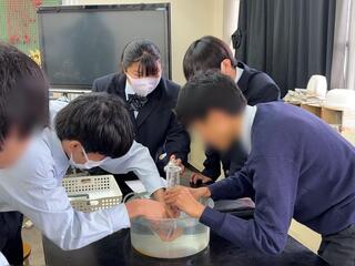 本日22日の2年生の理科の授業です。空気の質量と体積を調べ、密度を求める実験をしていました。 1 まず、空のスプレー缶に空気を充填し、スプレー缶のみの重さと空気を入れた後のスプレー缶の重 さを量ります。 2 水上置換法(覚えてますか?)を用いて、スプレー缶の中の空気をメスシリンダーに何回かに分けて集め、体積をはかります。水上置換は、水中で気体を集めるので,集めた気体が逃げられないというメリ...