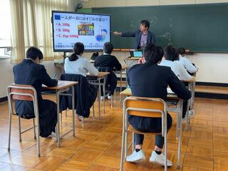 2年生の社会の授業です。今日のトピックスとして、高市総理の話がありました。タイムリーに時事問題を取り上げて話をするのは大事なことだと思います。生徒からも石破元総理のことなど、質問が出ていました。 さて、本日の授業の本題は、身近な環境問題として、ごみの問題について学びました。私たちが出しているごみの量や中身等の実態に迫り、ごみ処理や分別の学習へとつないでいきます。 生徒たちからは、積極的に...