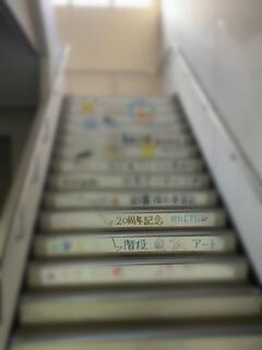 図書掲示委員会の20周年プロジェクトとして、階段アートを展示しました。たまフェス文化の部でご覧ください。今見てしまっては楽しみがなくなるので、 "ぼかし" を入れています(笑)ぜひ、お越しください! (写真は西階段です。他にもあります!)