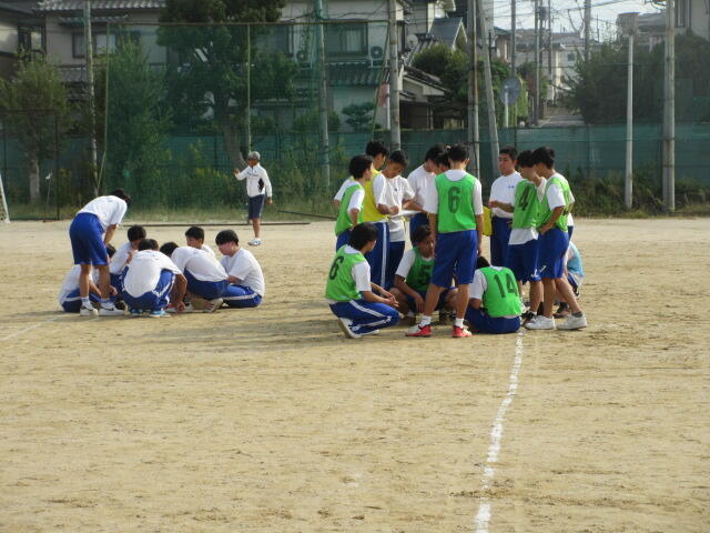 その後、チームでの作戦タイムがあり、チーム対抗のゲームが始まりました。ゴールが決まると歓声があがっていました。ゲームが終了して各チームの振り返りがありました。改善点を共有することで次の時間のチーム練習へといかしていくこととなります。
