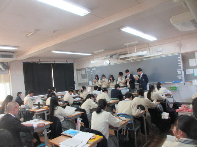 単元(教材)は、「項王自刎」⦅史記⦆です。前半は、2つのグループから音読と現代語訳の発表がありました。それぞれのグループの現代語訳には、工夫があり大変興味深い内容となっていました。アンパンマンのストーリーに置き換えての現代語訳には、感心しました。そして、担当の先生からグループで取り組む上で苦労したことなど様々な質問がありました。生徒たちは、質問に対してしっかりと自分の言葉で答えていました。