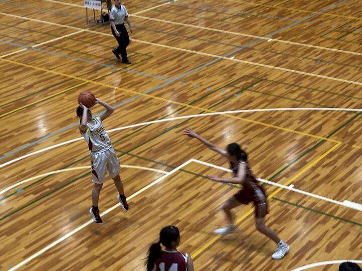準々決勝は、久米田高校との対戦となりました。第1クオーターは、双方のディフェンスが固くなかなか得点が入りませんでした。第2クオーターに入ってゲームが動き出し、本校がボールを支配する時間が多くなり、次々にシュートを決めて得点を重ねていきました。その後も本校のペースでゲームが進み得点差を広げて勝利しました。