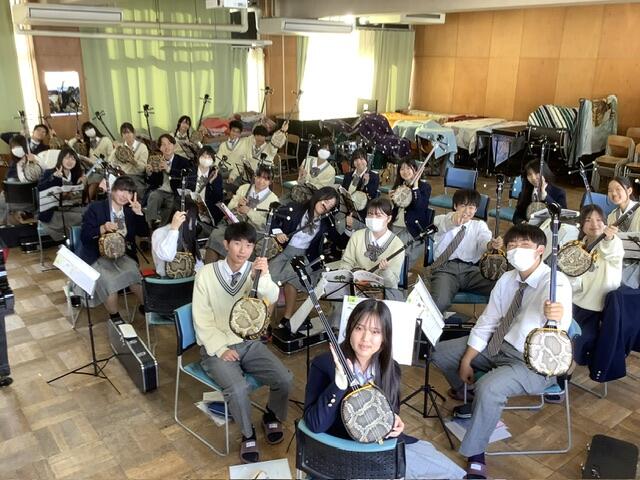 本日5限目、1年生音楽Ⅰの授業です。 三線に取り組んでいます。課題曲は「海の歌」と「てぃんさぐぬ花」です。 「てぃんさぐぬ花」についての知識を深めたり、模範の演奏動画を視聴したのち、来週の発表に向けてグループに分かれて練習しました。最後に全員で「海の歌」の演奏をしました。沖縄にいるみたいな気持ちになりました。来週の発表Fight!٩(^‿^)۶ IMG_1055.jpeg