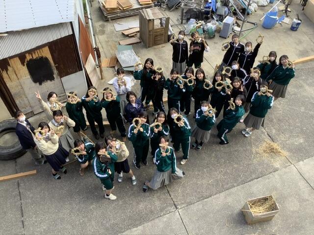 3限目 3年生選択科目 保育基礎の授業です。 藁を一掴みして半分に分け、それぞれ捻ったうえで撚り合わせ。最後に輪っかにして結びます。 今日の授業ではここまでですが、さらに装飾を施して完成です。 みんな協力して撚り合わせしていました。