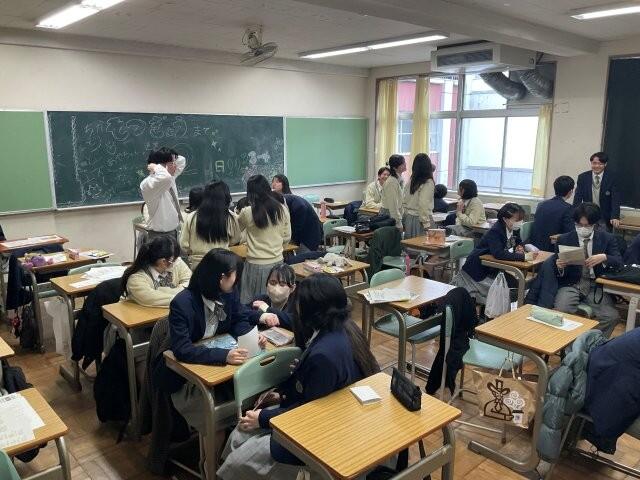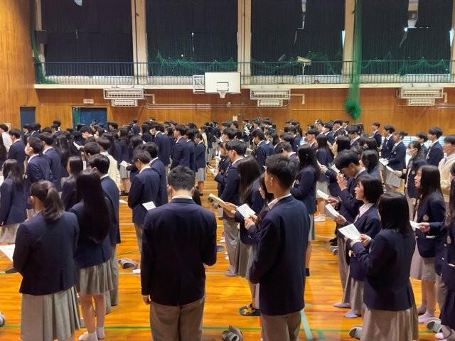 本日は、進路状況の確認や卒業式に関する諸連絡を行った後、体育館にて校歌・式歌の練習を行いました。 また、備蓄用のビスケットや水も各自に配付されました。 すべて終了したあと、各クラス10名が体育館の設営に協力してくれました。