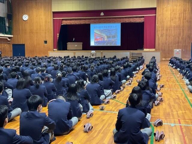昨日、1・2年生は修了式を迎えました。教科書販売があったため、本日は学年ごとに時差登校となりました。 【教科書販売の様子】 校長式辞では、この修了式までに活躍した部活動の紹介や、第74回卒業証書授与式の報告がありました。また、オリンピックの「りくりゅうペア」に関する話もあり、リスペクトの精神や挑戦する心を大切にしてほしいというメッセージが伝えられました。さらに、「進路の手引き」に掲載されている先...