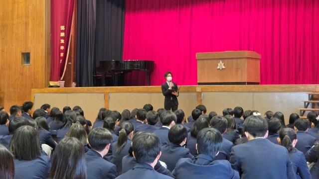 始業式では校長先生の式辞があり、部活動の活躍やアメリカ短期語学研修の報告、さらにAI時代をどのように生きていくかについてのお話がありました。