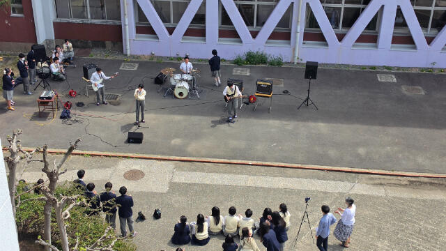 昨日の吹奏楽部に続き、本日はフォークソング部によるランチタイムコンサートが行われました。ギターやドラム、ボーカルの音色が中庭に響き、昼休みを明るく盛り上げました。