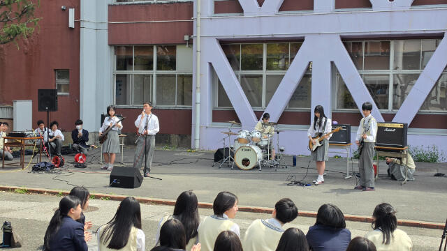 昨日の吹奏楽部に続き、本日はフォークソング部によるランチタイムコンサートが行われました。ギターやドラム、ボーカルの音色が中庭に響き、昼休みを明るく盛り上げました。 観客の生徒たちも手拍子で応え、笑顔あふれるひとときとなりました。 フォークソング部の皆さん、素敵な演奏をありがとうございました!