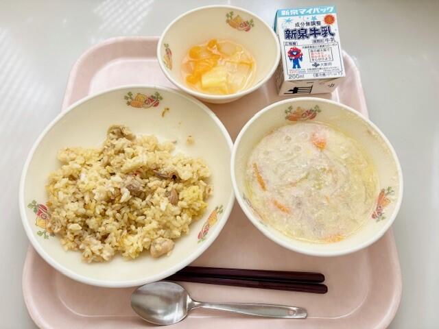 カレーピラフ、キャベツの豆乳スープ、フルーツ寒天、牛乳