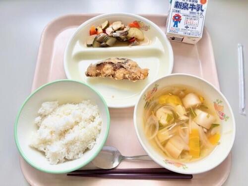 ごはん、アジの竜田揚げ、夏野菜の甘酢炒め、麩のすまし汁、牛乳