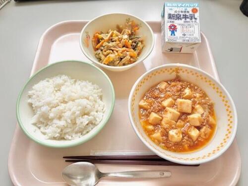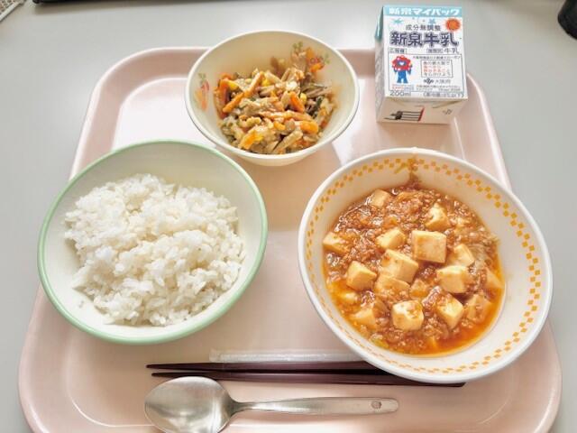 ごはん、マーボー豆腐、ごぼうサラダ、牛乳
