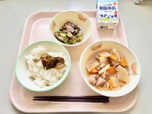 ごはん、鶏と根菜の甘酢煮、オクラとナスの煮浸し、きゅうりの佃煮、牛乳