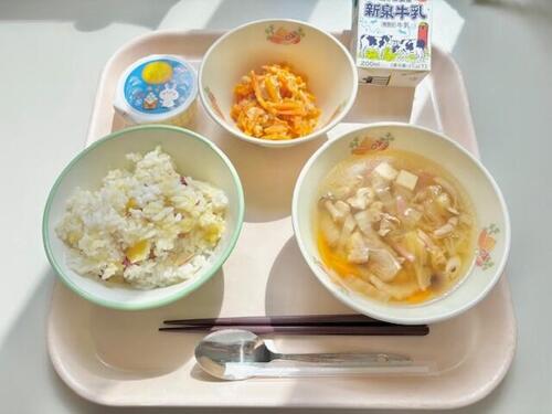さつまいもごはん、ニンジンのツナマヨ炒め、五目スープ、お月見ゼリー、牛乳