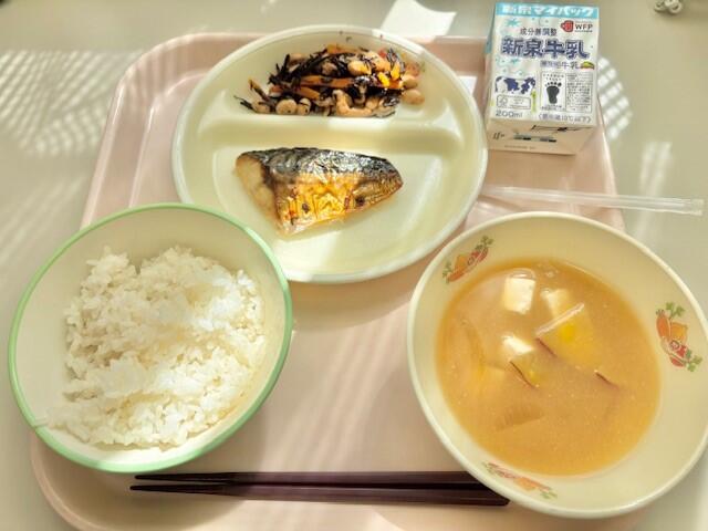 ごはん、サバのネギ塩焼き、ひじきの煮物、さつまいものみそ汁、牛乳