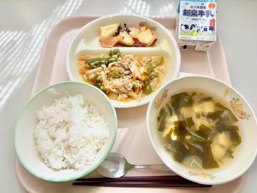ごはん、チンジャオロースー、わかめスープ、大学芋、牛乳