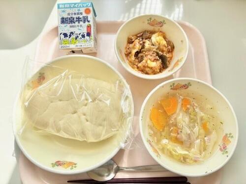 オリーブパン、なすのミートグラタン、コンソメスープ、牛乳