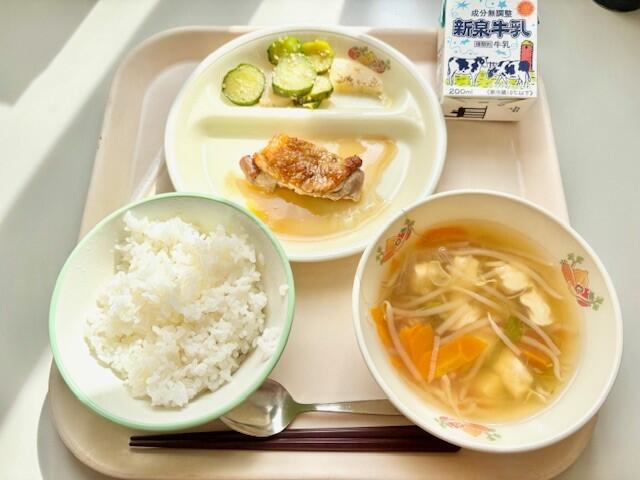 ごはん、鶏の照り焼き、きゅうり炒め、もやしのスープ、牛乳