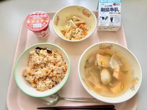 中華おこわ、キャベツのごま和え、のっぺい汁、ヨーグルト、牛乳